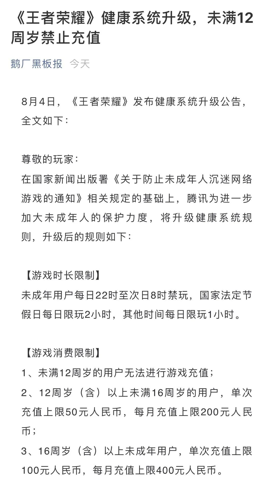 接着8月4日,微信公众号“鹅厂黑板板”公告称,为进一步加大未成年人的保护力度,将升级健康系统规则,未成年用户每日22时至次日8时禁玩,国家法定节假日每日限玩2小时,其他时间每日限玩1小时。未满12周岁的用户无法进行游戏充值;12周岁(含)以上未满16周岁的用户,单次充值上限50元人民币,每月充值上限200元人民币;16周岁(含)以上未成年用户,单次充值上限100元人民币,每月充值上限400元人民币。
