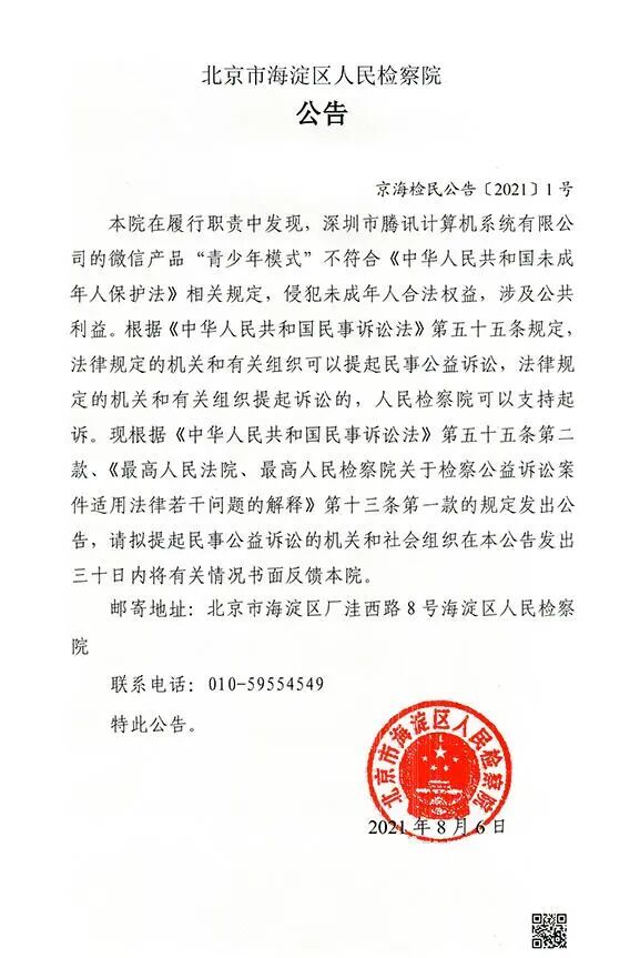 很快腾讯就进行了回应,腾讯称,悉闻北京市海淀区人民检察院有关微信产品“青少年模式”相关公告的报道,我们将认真自检自查微信青少年模式的功能,并且虚心接受用户建议以及诚恳应对民事公益诉讼。
