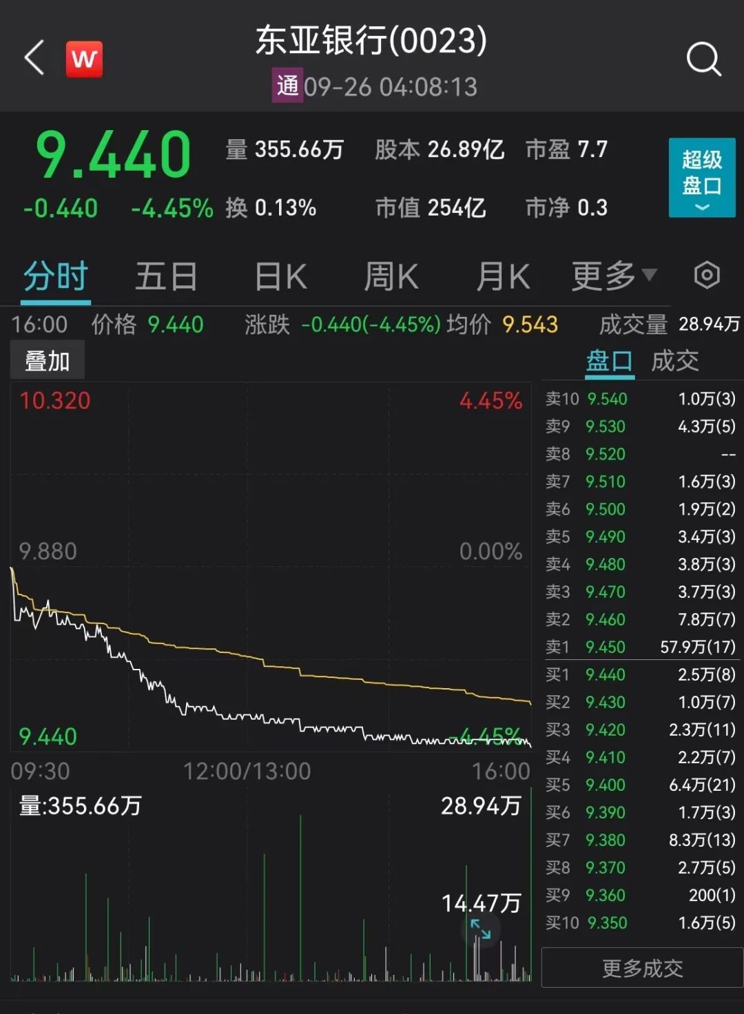 9月26日,东亚银行股价跌4.45%。