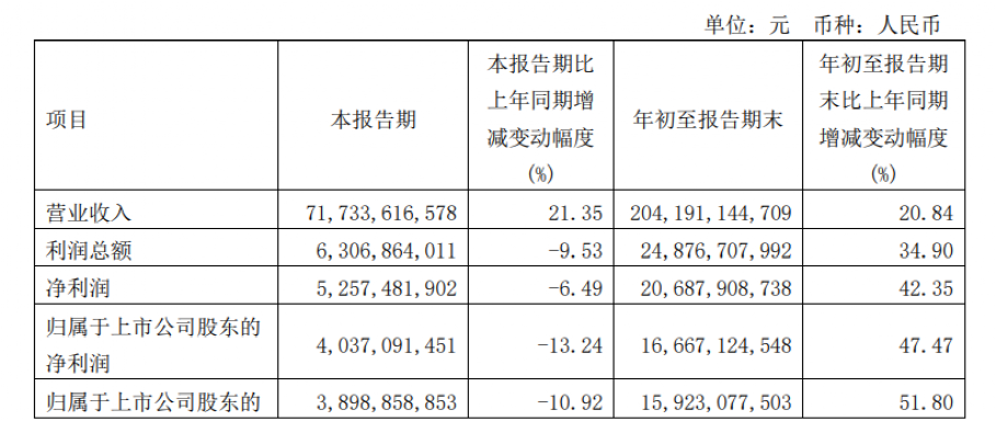 10月21日晚间,紫金矿业发布2022年第三季度报告,公司前三季度实现营业收入2041.91亿元,同比增长20.84%;实现归属于上市公司股东的净利润166.67亿元,同比增长47.47%。另外,公司第三季度实现营业收入717.34亿元,同比增长21.35%;实现归属于上市公司股东的净利润40.37亿元,同比下降13.24%。