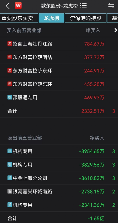 歌尔股份昨日登上龙虎榜,深股通买入565.24万元并卖出95.31万元,3家机构净卖出1.01亿元。