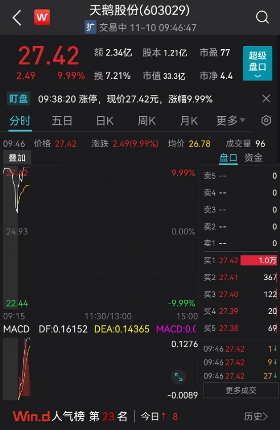 个股方面,天禾股份开盘一字涨停,天鹅股份盘初再度缩量触及涨停,录得9连板。湖南发展、浙农股份、中农联合涨超6%。