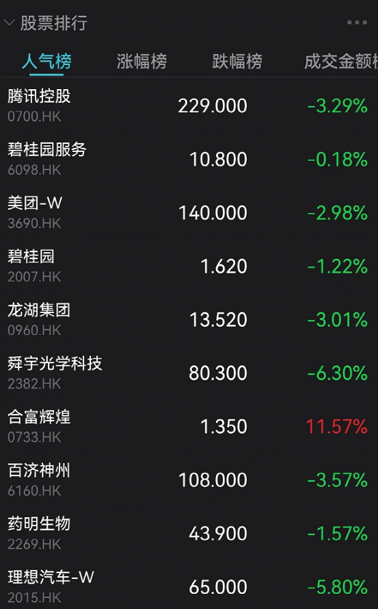 港股市场,恒指低开1.35%,恒生科技指数跌2.39%。科技、汽车股跌幅居前。舜宇光学科技跌超6%领跌蓝筹;腾讯、阿里巴巴跌超3%。