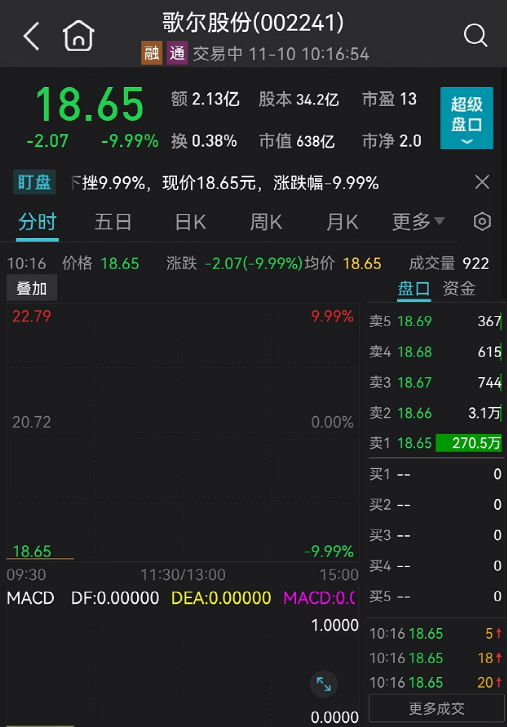 首先来关注昨日开盘直接砸到跌停的歌尔股份。经历了一整天的议论纷纷后,歌尔股份今日开盘继续一字跌停。股价来到18.65元/股,跌幅9.99%;曾经的千亿“果链”明星,如今市值已跌至638亿。