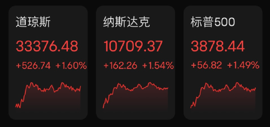道指收盘上涨526.74点,涨幅为1.60%,报33376.48点;纳指涨162.26点,涨幅为1.54%,报10709.37点;标普500指数涨56.82点,涨幅为1.49%,报3878.44点。