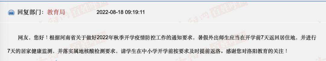 根据河南省关于做好2022年秋季开学疫情防控工作的通知要求,暑假外出师生应当在开学前7天返回居住地,并进行7天的居家健康监测,并落实属地核酸检测要求,请学生在中小学开学前按要求及时提前返洛。感谢您对洛阳教育的关注!