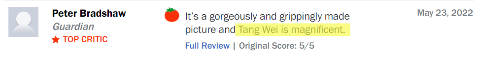 《卫报》盛赞汤唯,「非常惊艳,有着一种内敛迷人的性感」;