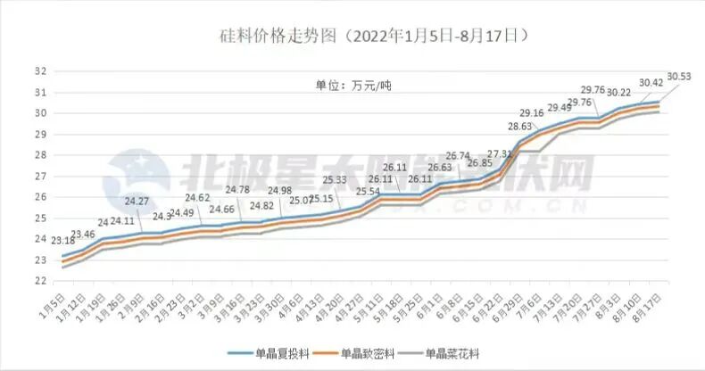 据北极星太阳能光伏网统计:截止8月17日,硅料已连续上涨27次,平均30.53万元/吨,相比年初的23万元/吨左右的价格,累计涨幅已经超过30%。