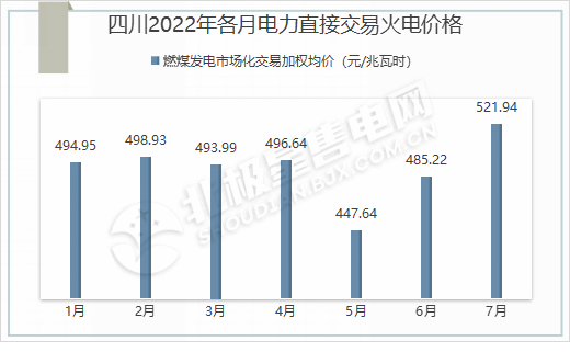 电力供不应求导致电价增加反映在电力直接交易火电价格上。从下图2022年1-7月四川电力直接交易火电价格来看,7月电力直接交易火电价格达到新的高峰,为521.94元/兆瓦时。此价格为省内交易和省间外购电量的加权均价。
