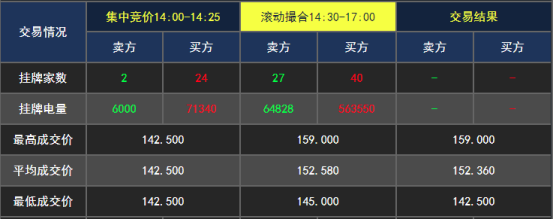 下图是第五轮的成交结果图,集中竞价阶段,买卖双方挂牌电量比达到11.89:1,滚动撮合阶段,最高成交价已达159元/兆瓦时,买卖双方挂牌电量比为8.69:1。