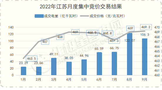 8月24日,江苏电力交易中心公布9月集中竞价交易结果。结果显示,本次交易共成交电量106.03亿千瓦时,成交价格469.2元/兆瓦时,其中售电公司成交86.73亿千瓦时,一类用户成交7.46亿千瓦时,国网江苏省电力公司成交11.84亿千瓦时。