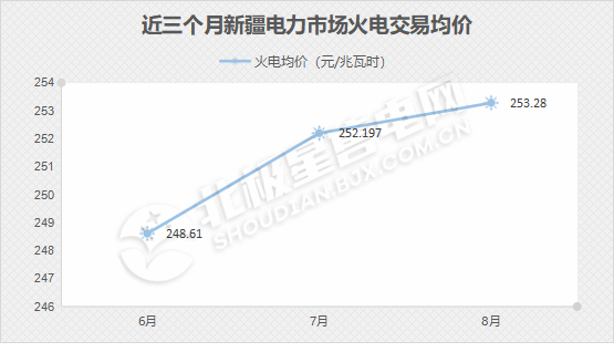 近三个月新疆电力市场火电交易成交均价呈现逐月增加趋势。6月为248.61元/兆瓦时,7月为252.197元/兆瓦时,8月为253.28元/兆瓦时。