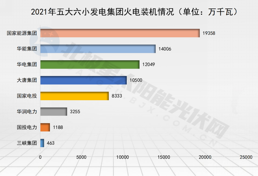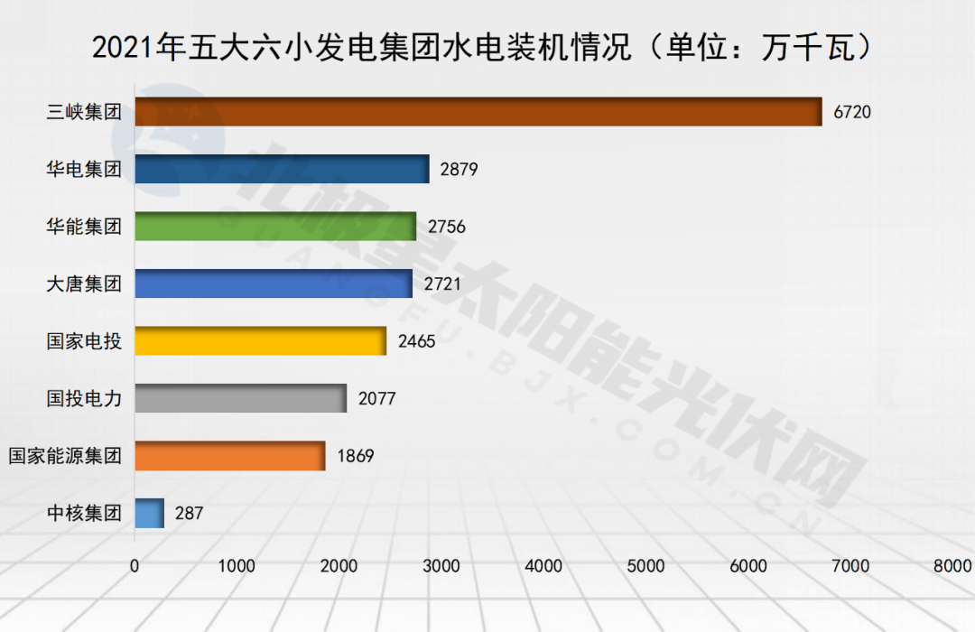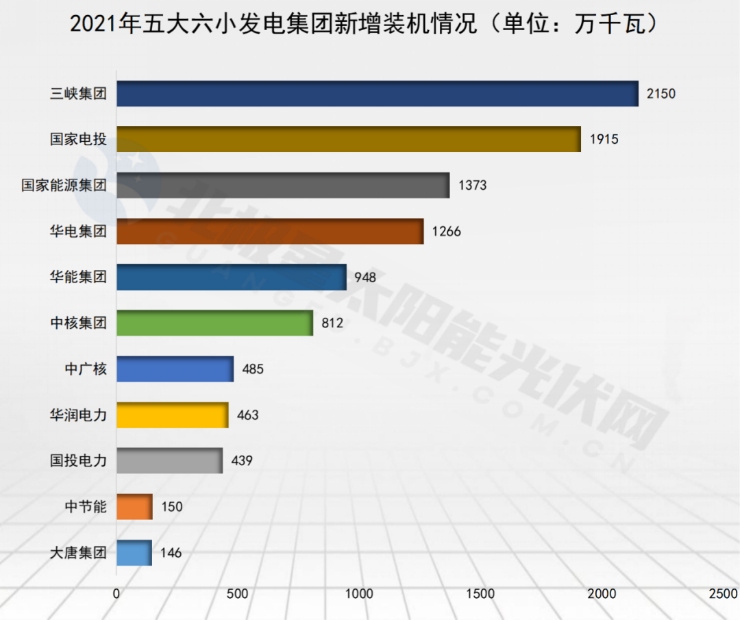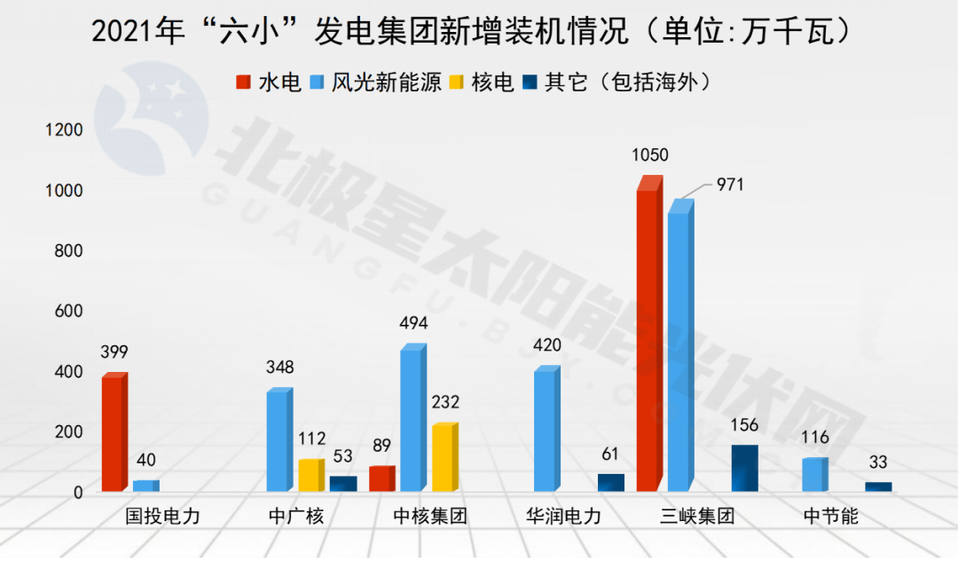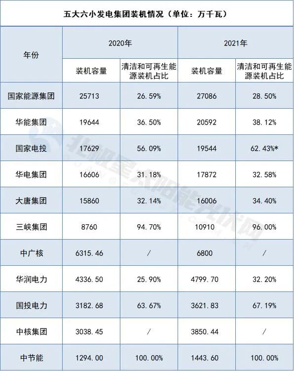 五大六小发电集团都在发力新能源,并且成为新能源装机中坚力量,截止2021年底,五大六小新能源装机情况如下: