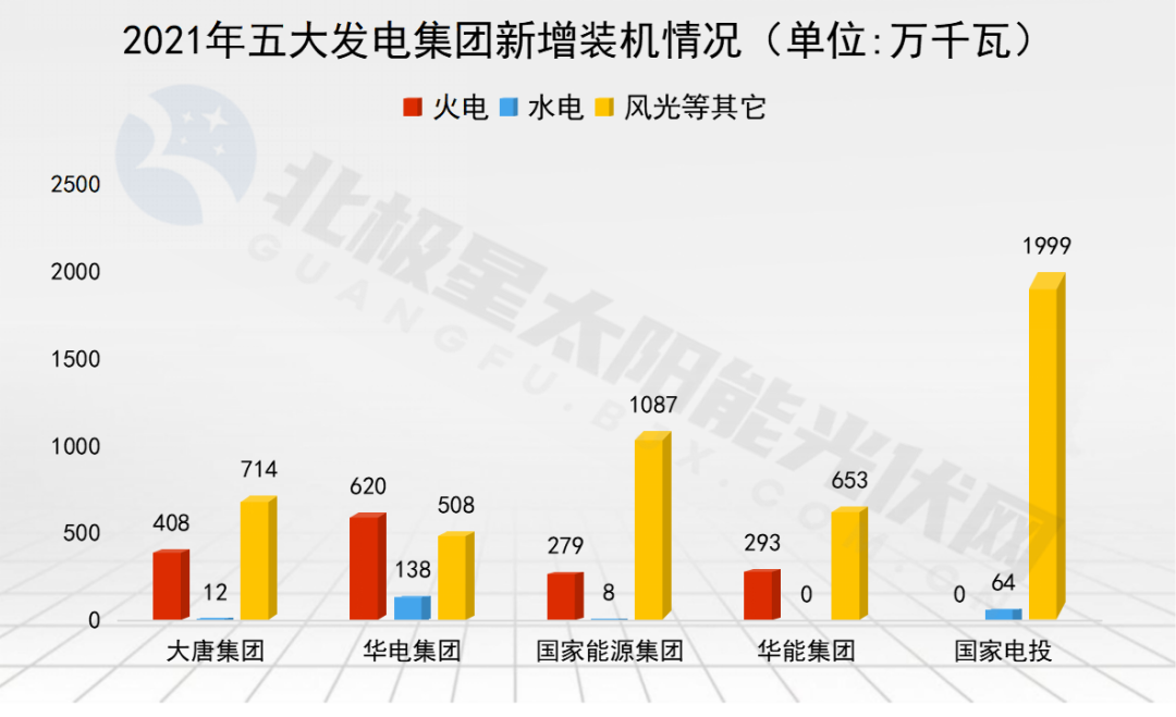 五大发电集团:2021年新增装机主力虽全部在风光等新能源,但除国家电投之外,其它发电集团在火电机组方面亦有新增。