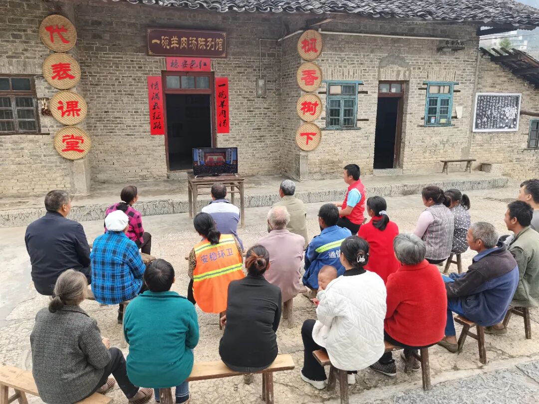 ▲安稳镇崇河村驻村工作队与脱贫户、五保户、安稳山羊养殖大户及大屋基院落村民在长征路上的“一碗羊肉汤”陈列馆收看开幕会。