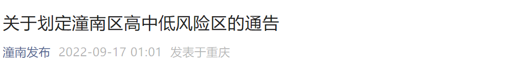 根据当前潼南区疫情防控工作需要,按照《新型冠状病毒肺炎防控方案(第九版)》《重庆市新冠肺炎疫情风险区划定及管控指南(2022年第一版)》相关规定,经专家研判和区疫情防控指挥部研究,并报经市疫情防控指挥部同意,自2022年9月16日起,在辖区内划定疫情高中低风险区,具体如下。