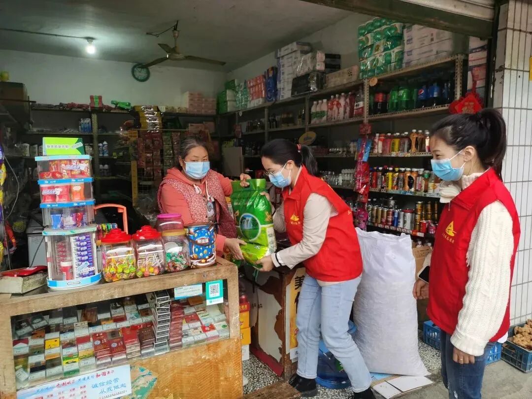 在三角镇新时代文明实践所,镇政府工作人员和志愿者们,正在齐心协力地把采购的大米、菜油和面条等生活物资装上车,及时送到望石村临时管控区卡点,保障村民生活需要。