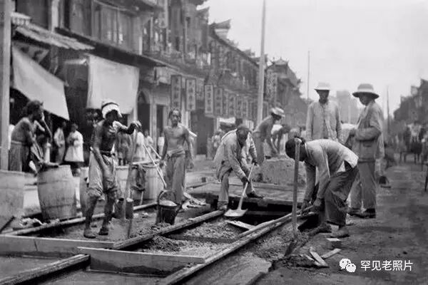 1907年,上海南京路,英商上海电车公司雇佣工人在此铺设电车轨道。