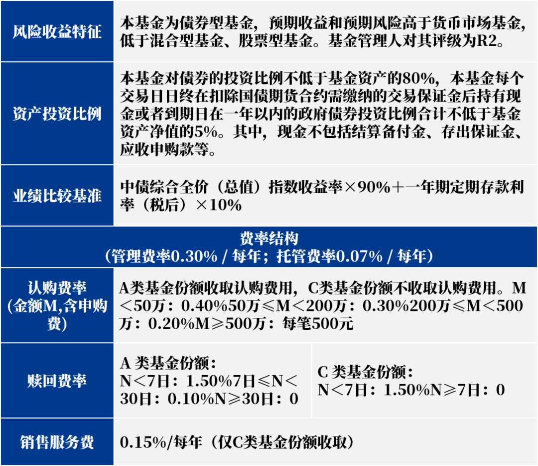 投资比例:本基金对债券的投资比例不低于基金资产的80%,不投资于股票,也不投资于可转换债券(可分离交易可转债的纯债部分除外)、可交换债券,且每个交易日日终持有现金或者到期日在一年以内的政府债券投资比例合计不低于基金资产净值的5%。
