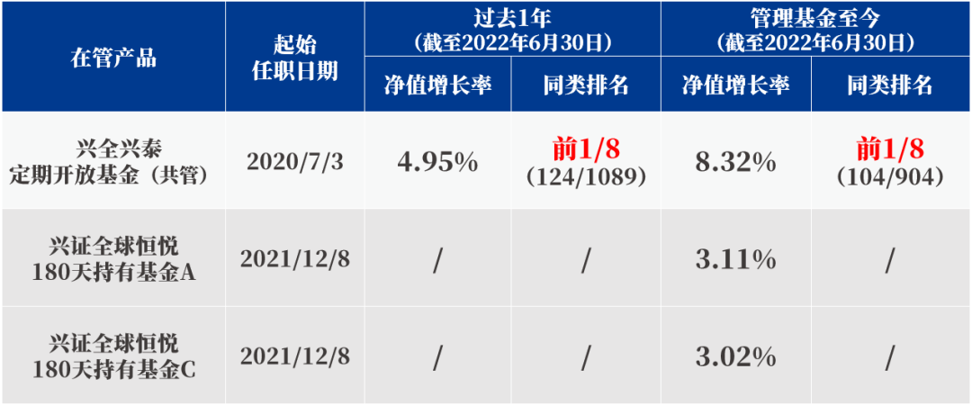 兴证全球恒悦180天持有基金成立未满一年,排名信息不作列示。总计管理规模数据来源:2022年第2季度报告,截至2022年6月30日;兴全兴泰定期开放基金排名数据来源:银河数据,截至2022年6月30日。兴全兴泰区间净值增长率已经托管行复核。兴全兴泰业绩比较基准:中证全债指数收益率。田志祥:2015年7月加入兴证全球基金管理有限公司,历任兴证全球基金管理有限公司研究员,2019年3月25日任投资经理助理,2020年3月27日任投资经理,现任兴全兴泰定期开放债券型发起式证券投资基金基金经理(2020年7月3日起至今,共管),兴证全球恒悦180天持有期债券型证券投资基金基金经理(2021年12月8日至今)。兴全兴泰定期开放成立以来截至2022年6月30日完整业绩及比较基准为25.10%/26.43%;兴全兴泰定期开放基金成立以来完整业绩及比较基准:2017/8/31-2017/12/31(0.54%/-0.24%),2018(7.60%/8.85%),2019(4.80%/4.96%),2020(3.00%/3.05%),2021(5.20%/5.65%),2022/1/1-2022/6/30(2.22%/1.90%);本基金业绩比较基准为:中证全债指数收益率。历任基金经理变更情况:2017/08/31-2019/04/25,翟秀华;2017/09/05-2020/10/22,张睿;2019/06/28至今,季伟杰;2020/7/3至今,田志祥;2021/8/27至今,王帅。兴证全球恒悦180天持有A成立以来完整业绩及比较基准:2021/12/18-2022/06/30(3.11%/2.13%);兴证全球恒悦180天持有C成立以来完整业绩及比较基准:2021/12/18-2022/06/30(3.02%/2.13%);本基金业绩比较基准为:中债综合财富(总值)指数收益率×90%+一年期定期存款利率(税后)×10%。历任基金经理变更情况:2021/12/08至今,田志祥。历史业绩不代表未来表现,投资需谨慎。