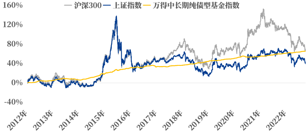 1.过往十年,中长期纯债基金指数/沪深300指数 年化收益率4.78%/6.36%,最大回撤-3.27%/-46.70%,年化波动率1.58%/21.43%。数据来源:WIND,区间2012年7月1日-2022年6月30日。