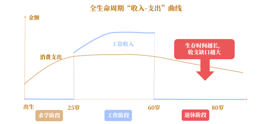 在人生中,我们都会面临两条曲线,一条是消费支出曲线,一条是工资收入曲线。在25岁之前,基本上处于大家求学的阶段,这段时间消费相对比较刚性,而支出基本上是靠父母的供养。在工作阶段,开始有工资的收入,一般的工资收入会比消费的支出高一些,你会利用工资收入来覆盖自己的消费,也会有一定的储蓄。到60岁之后的退休阶段,工资收入没有了,消费又是相对比较刚性的,收支缺口开始出现。随着科技和医学的发展,人的寿命会越来越长,生存的时间越长,收支的缺口也会越大,面对收支缺口越来越大的困境,我们应该怎么进行解决?