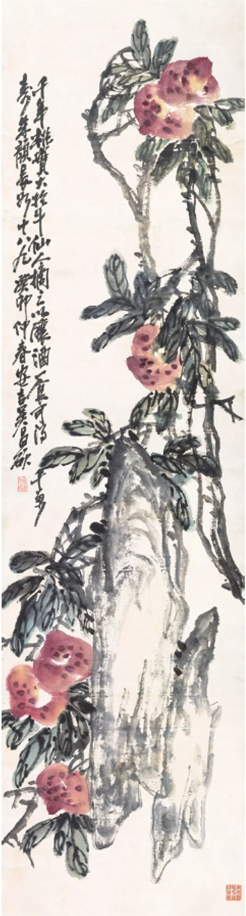 艳于赤城霞,罗浮春事早。年年看花人,颜色如华好。翰臣先生雅属,甲子夏,吴昌硕年八十一。