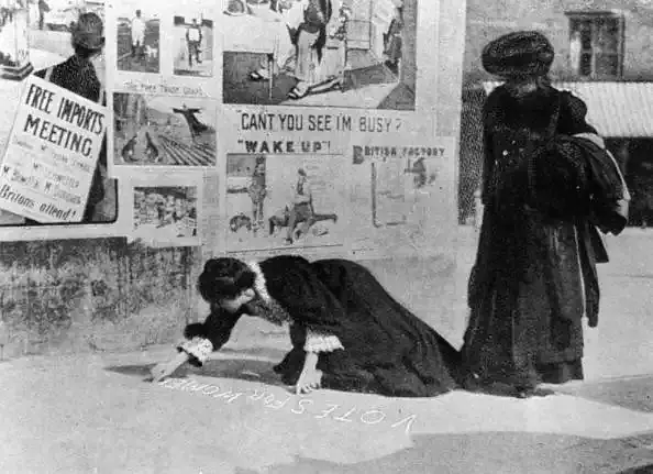 1907年英国,Annie Kenney和Mary Gawthorne在地上写下要求女性有选举权的口号 。