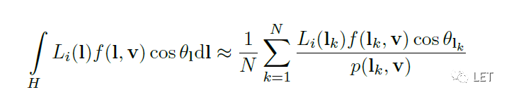 同样的道理,只要我们有足够的,随机的光线来模拟,最终的结果也是接近真实的,这就是Monte Carlo method。如因此我们可以推导出如下的公式,这里稍有不同的是分母中多了一个PDF(probability density function)的概念,用来做IS(Importance Sampling),作用是提高概率高的光线的权重,目的是在用尽可能少的N来获取尽可能正确的结果,reduce variance。