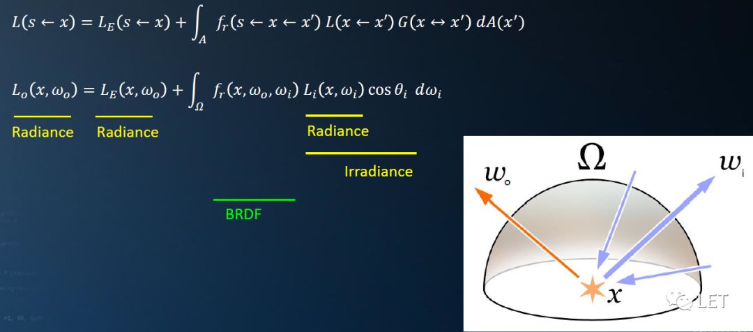 这里,L是光照的强度,G是Geometry的意思,比如是否有遮挡,光源和点x的夹角等。f是bidirectional reflectance distribution function,从ω(i)点射入的irradiance和反射到ω(0)方向的radiance之间的比例系数。请大家自行理解radiance和irradiance。