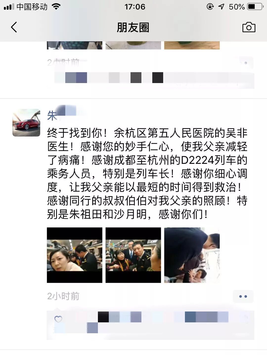 事后,大伯的儿子朱先生发的一条朋友圈引来了许多点赞。他也终于找到了D2224次列车上那个热心的女医生,并赶来医院当面向吴非表示感谢。