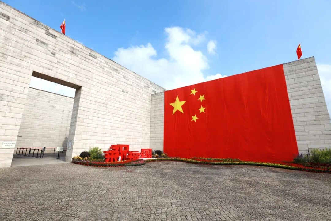▲良渚博物院入口处外墙,挂着一面高近9米,面积达120平米的巨大的五星红旗