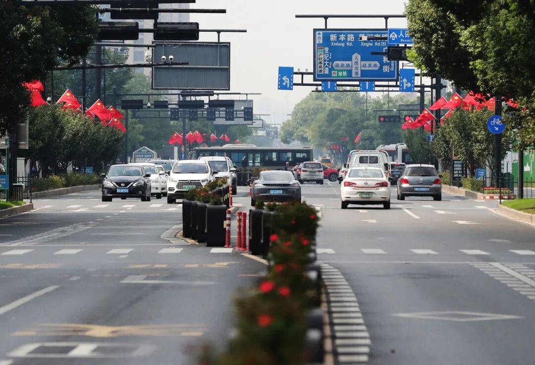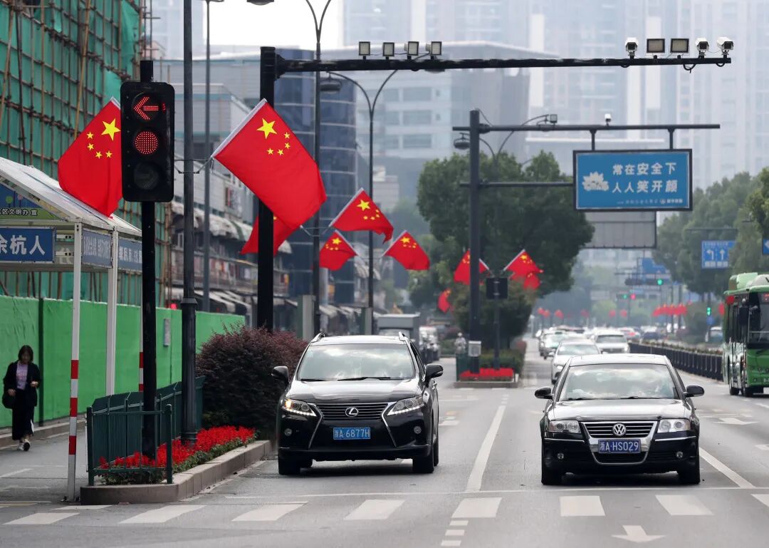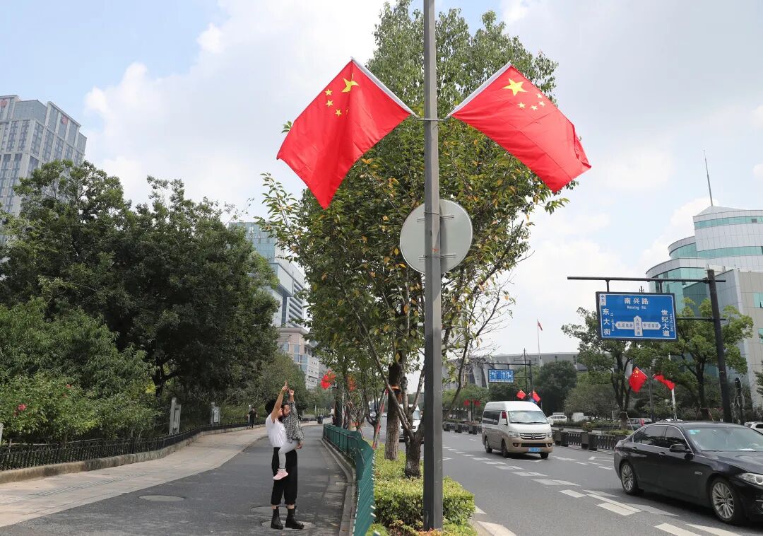▲临平人民广场附近,一位母亲引导孩子观看街头悬挂的五星红旗