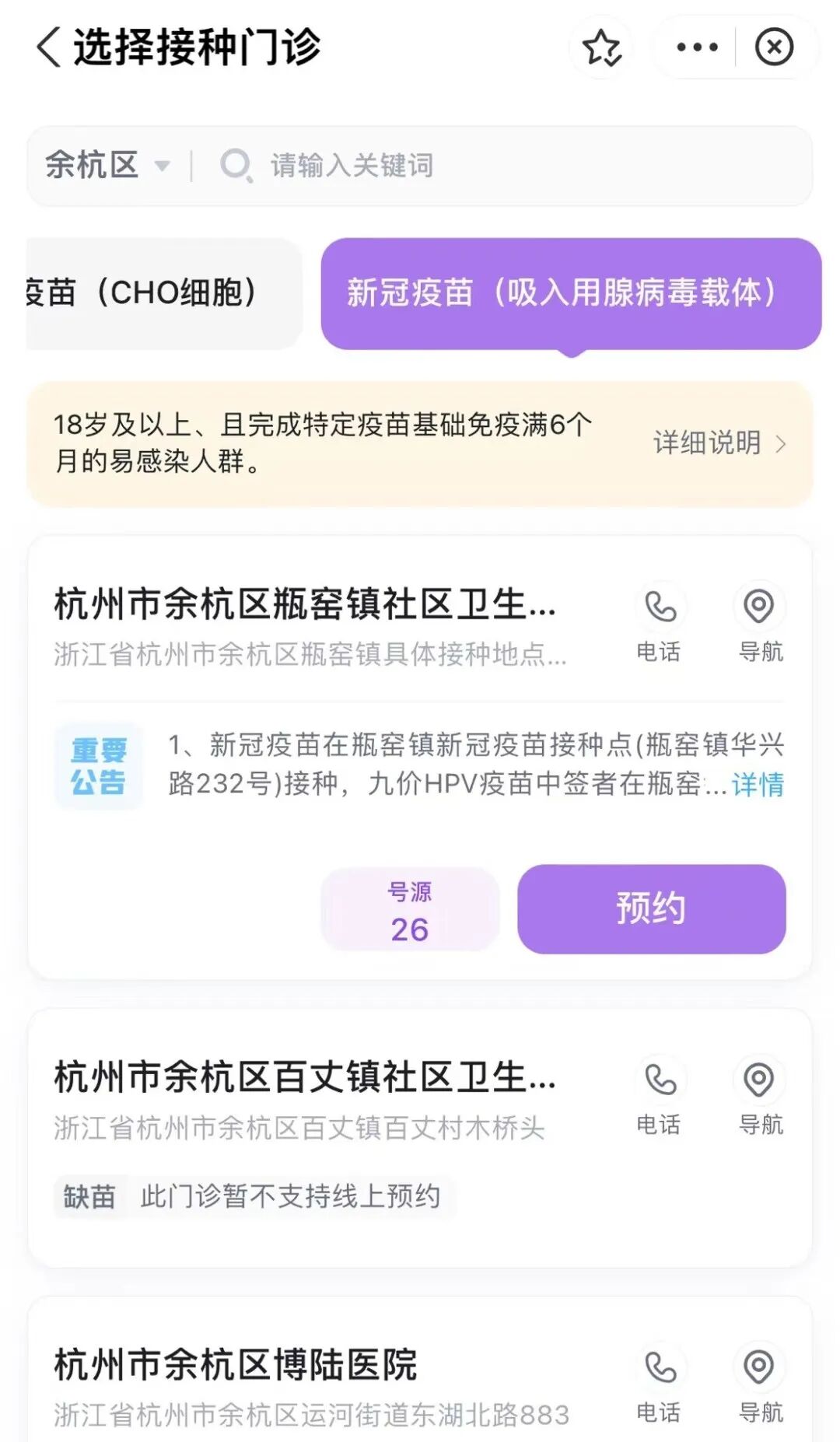 目前余杭区瓶窑镇、五常街道已率先开启“吸入用”新冠疫苗接种。“吸入用新冠疫苗”实行免费接种。