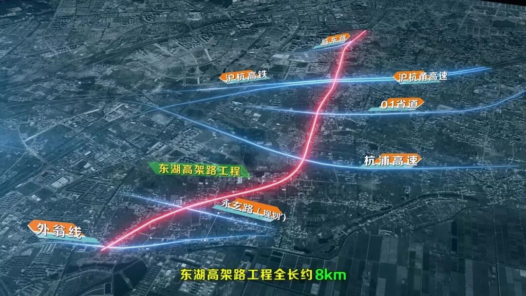 东湖高架路作为余杭区“三路一环”快速路网中的“一路”,南起外翁线,连接已建成通车的东湖快速路(即外翁线以南段),经杭浦互通、沪杭互通,下穿沪杭高铁,北至临东路,全长约8公里。