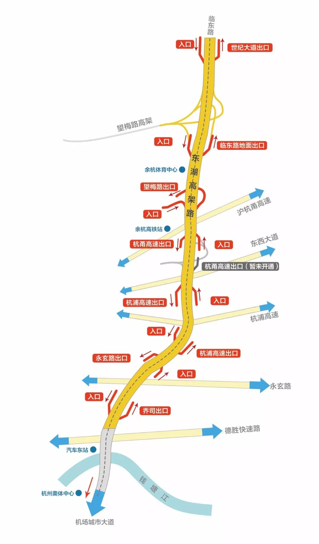 东湖高架路由北往南在临东路、东湖南路、沪杭甬高速、杭浦高速南北两侧、永玄路等节点设置6对平行匝道。