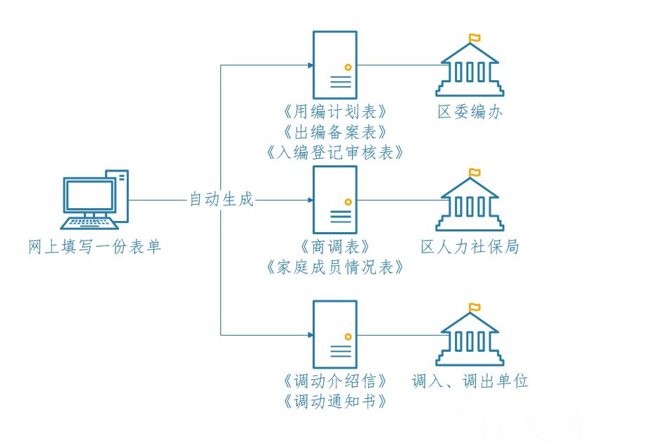 针对机关内部办事材料内容重复多、表单数量多、提交次数多的问题,我区统一编制事项办事指南和流程图,注重材料精简和流程再造。比如,瓶窑镇社区卫生服务中心职工陈某调往百丈镇社区卫生服务中心工作,调入和调出单位的人事管理人员原本需要填写7份表单、339项内容,往返6趟,现在只需要网上采集1份表单次、53项内容,一次不用跑。