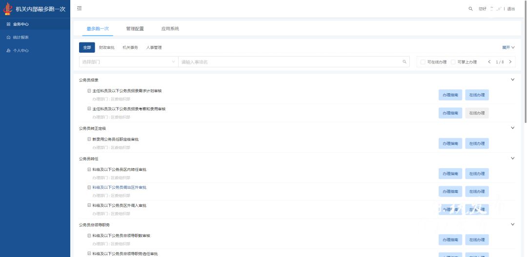 今年以来,我区积极探索推进“最多跑一次”改革工作向机关内部管理领域延伸,选取区委组织部、区人力社保局、区财政局、区机关事务服务中心四个部门作为第一批试点单位,全面梳理部门间办事事项清单。目前改革已经由点及面,扩面到全区所有机关单位。
