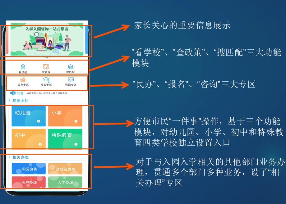 “入学早知道”的核心目标是围绕缓解入学难问题,打造紧贴市民入园入学服务需求与政府教育服务供给与治理需求的教育公共服务平台。
