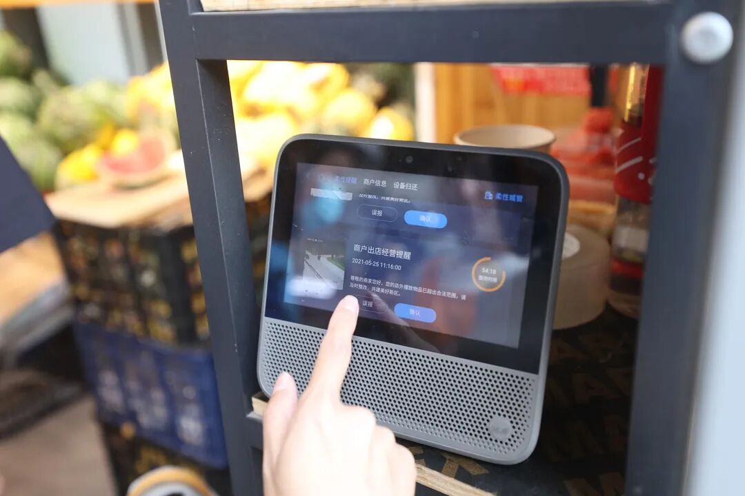 “未来街区”内近百家店铺拥有专属的“驻店小助手”。如果店铺门口出现出店经营,10分钟内“驻店小助手”就会以语音提醒商家:“尊敬的商家您好,您的店外存在出店经营违规行为,请及时整改,共建美好新区”。同一时间,业主也会收到短信提醒。同样,如果店铺出现垃圾抛洒、沿街晾晒等不文明行为,“驻店小助手”都会提醒商家整改。商家整改状况不够理想的话,系统会经自动复核后派件给城管网格管理人员进行上门处置。