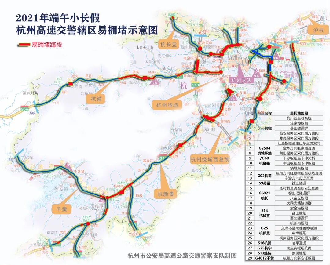 端午期间,杭州高速交警将增加警力驻扎路面,全警全员值班备勤,做到快速处警、动态响应,全力保障辖区高速公路畅通和人民群众出行安全,期间在辖区各条高速设立23个交通事故快速处理点:
