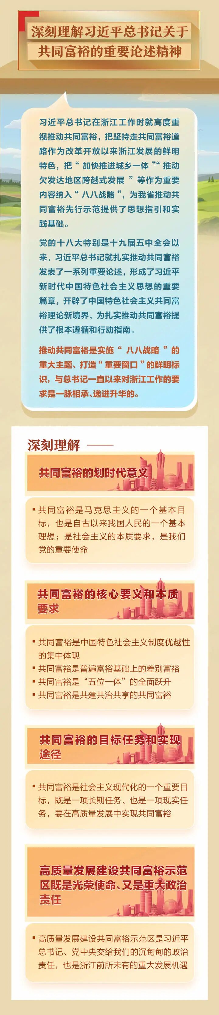 会议指出,习近平总书记在浙江工作时就高度重视推动共同富裕,把坚持走共同富裕道路作为改革开放以来浙江发展的鲜明特色,把“加快推进城乡一体”“推动欠发达地区跨越式发展”等作为重要内容纳入“八八战略”,亲自部署实施山海协作、百亿帮扶、欠发达乡镇奔小康等重大工程,为我省推动共同富裕先行示范提供了思想指引和实践基础。党的十八大特别是十九届五中全会以来,习近平总书记就扎实推动共同富裕发表了一系列重要论述,形成了习近平新时代中国特色社会主义思想的重要篇章,开辟了中国特色社会主义共同富裕理论新境界,为扎实推动共同富裕提供了根本遵循和行动指南。在第一个百年目标即将完成、开启第二个百年新征程的历史性时刻,习近平总书记、党中央把推动共同富裕作为现代化建设的重要目标作出重大战略部署,必将推动中国特色社会主义迎来新的更大发展,为人类社会的文明进步作出更大贡献。中央《意见》阐明了党中央、国务院支持浙江高质量发展建设共同富裕示范区的战略意图,明确了示范区的顶层设计。我们要深刻理解共同富裕的划时代意义、核心要义、本质要求、目标任务和实现途径,深刻理解高质量发展建设共同富裕示范区是光荣使命,是重大政治责任,是浙江前所未有的重大发展机遇,必将为新发展阶段浙江的高质量发展、竞争力提升和现代化先行注入强劲动力。全会指出,高质量发展建设共同富裕示范区是习近平总书记亲自谋划、亲自定题、亲自部署、亲自推动的重大战略决策,是我们忠实践行“八八战略”、奋力打造“重要窗口”的核心任务,是扛起“五大历史使命”的总牵引。我们要坚定不移沿着习近平新时代中国特色社会主义思想指引的路子奋勇前进,深刻理解习近平总书记关于共同富裕的重要论述精神,进一步增强“四个意识”、坚定“四个自信”、做到“两个维护”。要在感恩习近平总书记、党中央关心厚爱中凝聚奋进的力量,进一步增强先行探路的责任感、使命感和紧迫感,在实践中进一步丰富共同富裕的思想内涵,率先探索破解社会主要矛盾的有效路径,让人民群众真切感受到共同富裕看得见、摸得着、真实可感,深入推进习近平新时代中国特色社会主义思想在浙江的生动实践。6月10日至11日,省委十四届九次全体(扩大)会议在杭州举行。