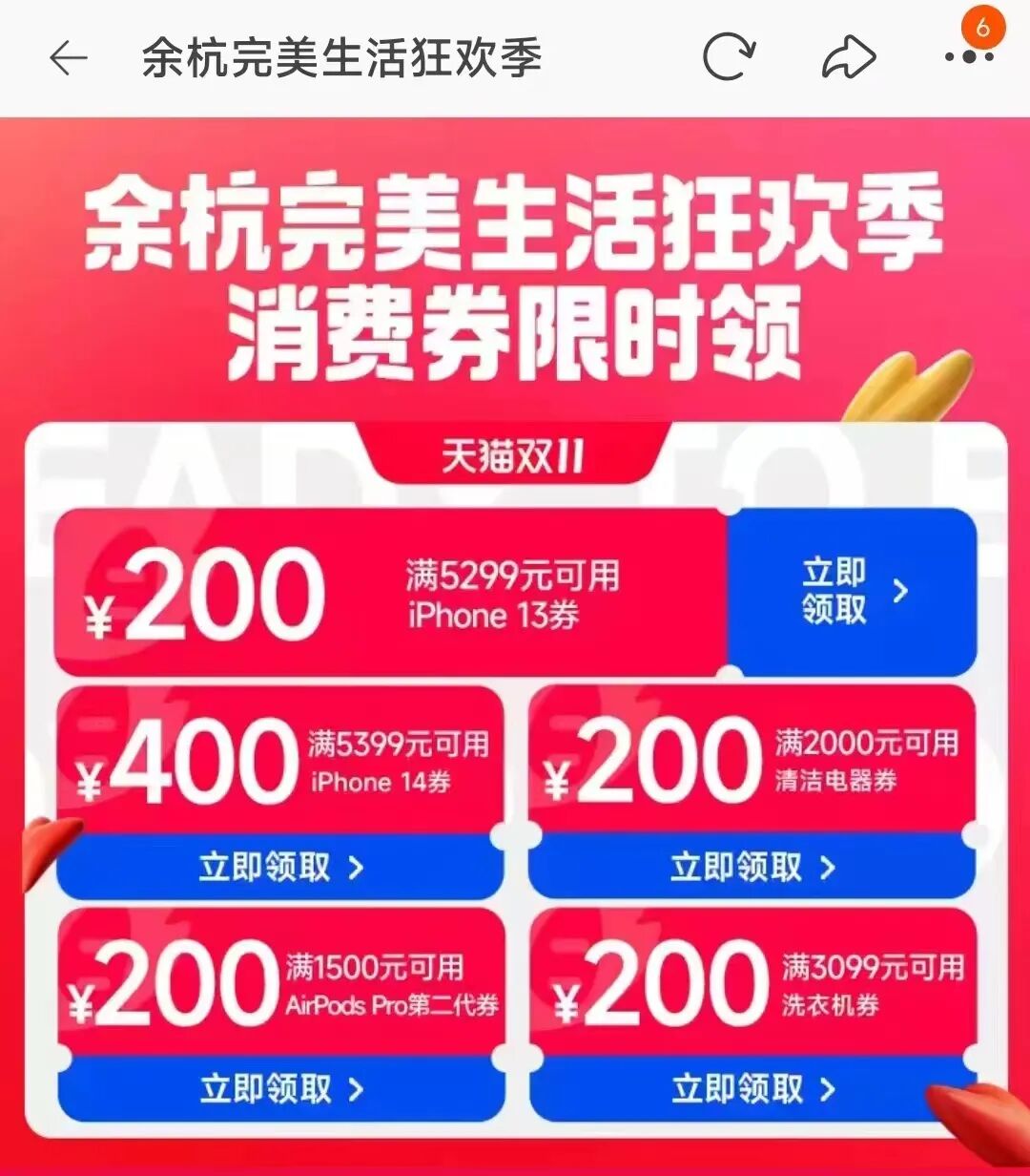 余杭数字消费券遇上天猫双11,优惠力度史无前例!以人气商品iPhone为例,原价5399元的128G版本iPhone13,双11喵速达电器补贴500元,叠加可领余杭5299-200消费券,便宜700元,到手4699元。此外,最新款iPhone14,可领400元余杭消费券,256G版到手价6499元。