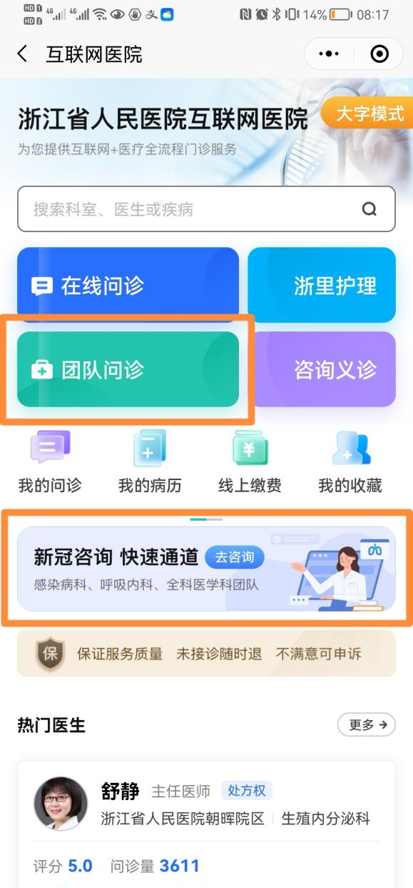 目前,浙江省人民医院互联网医院已开通“新冠咨询快速通道”,发热、咳嗽、咽痛等症状的患者,可通过“新冠咨询快速问诊通道”或“团队问诊”进入页面,感染病科、呼吸内科、全科医学科共30多位专家均在线“候诊”。