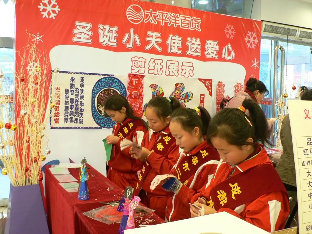 2006年12月由成都电视台和太平洋百货春熙店协办的义卖剪纸作品和现场剪纸表演,“圣诞小天使送温暖”活动,两位大队辅导和16名学生参加活动一天,共筹善款1400多元,送金堂特殊学校。