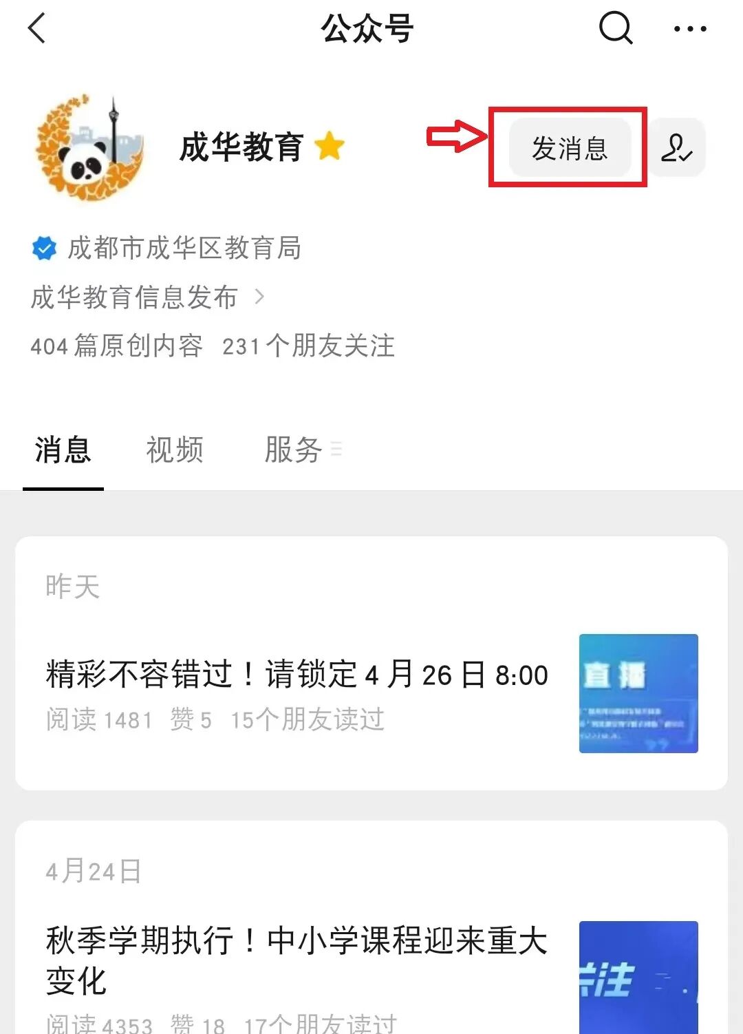 答:1.成华区教育局通过“成华教育”官方微信公众号推送了幼儿园相关信息,家长可搜索“幼儿园”关键词进行查询。【操作步骤如下】