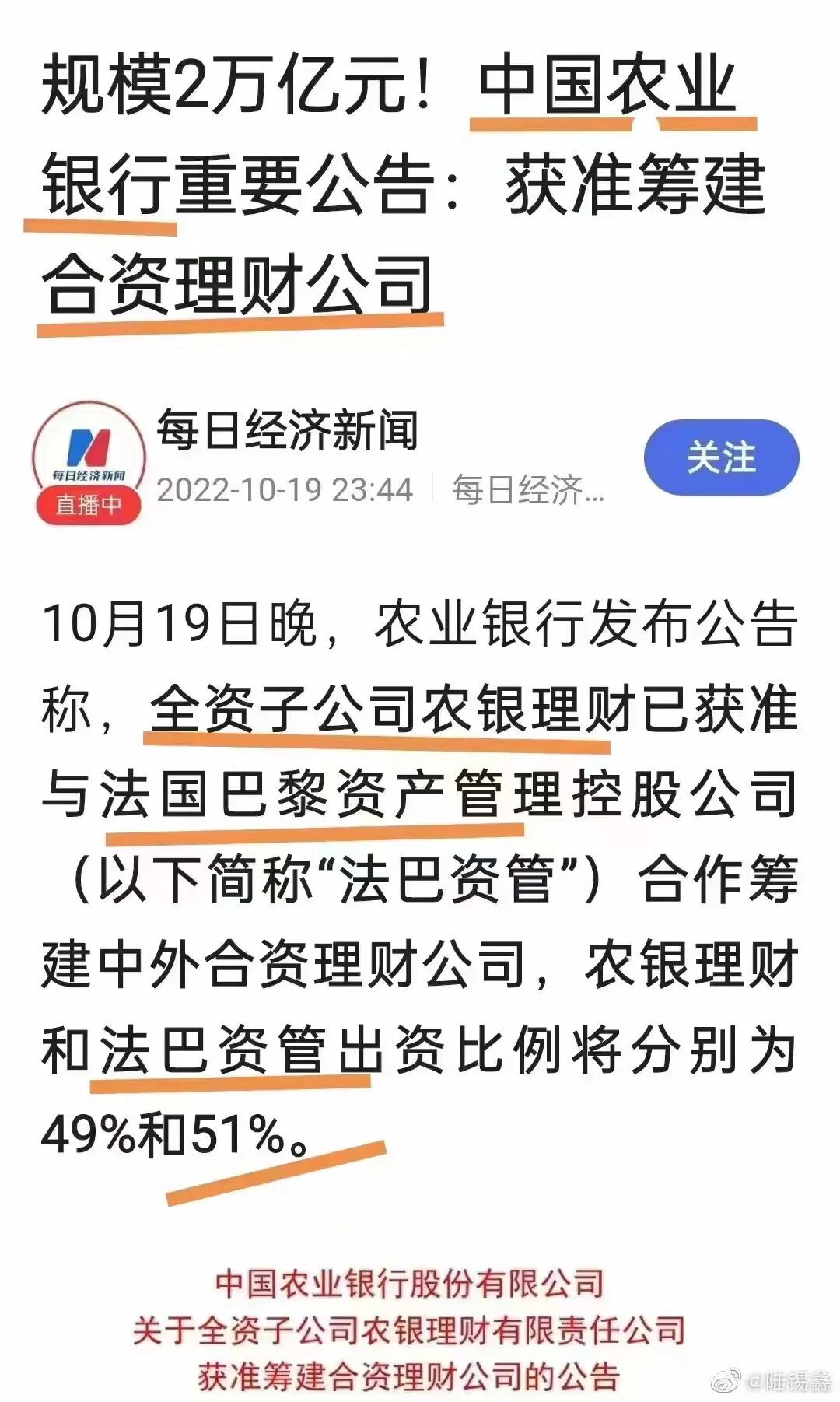 【1】《农行旗下农银理财获准与法巴资管合作筹建理财公司,农银理财出资比例为49%》,每日经济新闻,