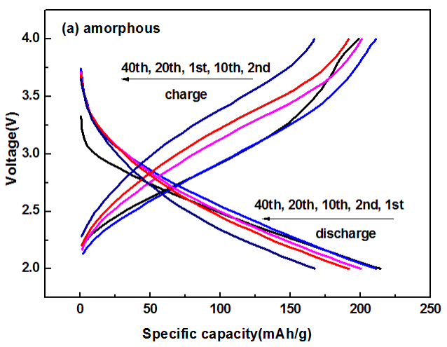 目前的锂离子电池正极材料,每分子只含一个锂原子和一个变价的过渡金属原子,充电时除磷酸铁锂可能接近脱去一个锂离子外,其它材料为保持晶格的稳定远达不到如此高比例,所以比容量难以充分利用.我们设想,如果每分子有2个变价元素,则比容量将会显著提高.为此我们提出了钒酸铁FeVO4 及Fe2V4O13,其设想的反应是FeVO4 +2Li++2e-= Li2FeVO4,经2个锂离子的嵌-脱,晶型可能发生两次改变,材料难以获得良好的可逆性.我们索性将材料制成无定形态,并将其固限在纳米炭孔中以长时间维持无定形态.此材料的首放比容量为249 mAh/g (相当于1.4个电子),40周后为228 mAh/g,见下图.司玉昌的博士学位论文被评为总装备部优秀博士论文,回武警部队后申请得二等科技进步奖.
