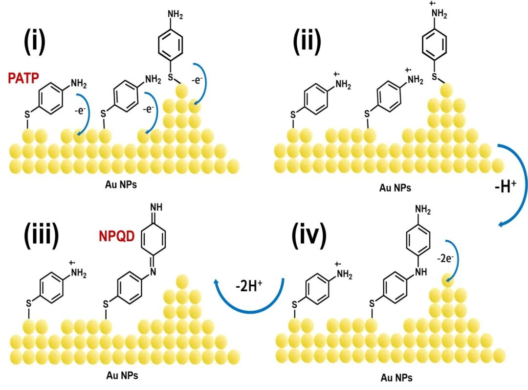 有机芳香硫醇类化合物在金(Au)表面上发生化学吸附,可形成有序自组装单层。对氨基苯硫酚,也称为对巯基苯胺(PATP),它是常用的表面增强拉曼(SERS)的模型探针分子,在大多数金属电极上具有很强的吸附能力,可达到吸附满单层的状态,并能产生强的SERS信号。同时,该分子在电化学电位极化和光作用下可发生不同的表面反应。前人已报道PATP有三种偶联方式:头头偶联转化为4, 4’-二巯基偶氮苯(DMAB);尾尾偶联转化为4, 4'-二氨基苯二硫醚;头尾偶联转化为4'-巯基-4-氨基二苯胺。然而,电极电位、溶液pH、激光功率等会对上述转化产生影响,从而影响电化学界面的电极过程。在纳米结构电化学界面,弄清电极界面电化学反应机理,并研究反应选择性和转化效率仍然是一个极具挑战性的问题。