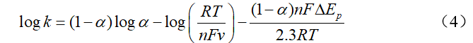 根据理论计算可以得到总反应的吉布斯自由能变,继而可计算出PATP电化学氧化的平衡电极电位E0=0.73 V(vs. SHE)。同时,从图4(a)中能够提取扫描速率(v)和氧化峰的峰值电位(Ep)的数值,并可以绘制出扫描速率(v)与Ep–E0之间的对应关系,如图4(b)所示。由文献可知,Ep-E0与扫速的对数满足线性关系,